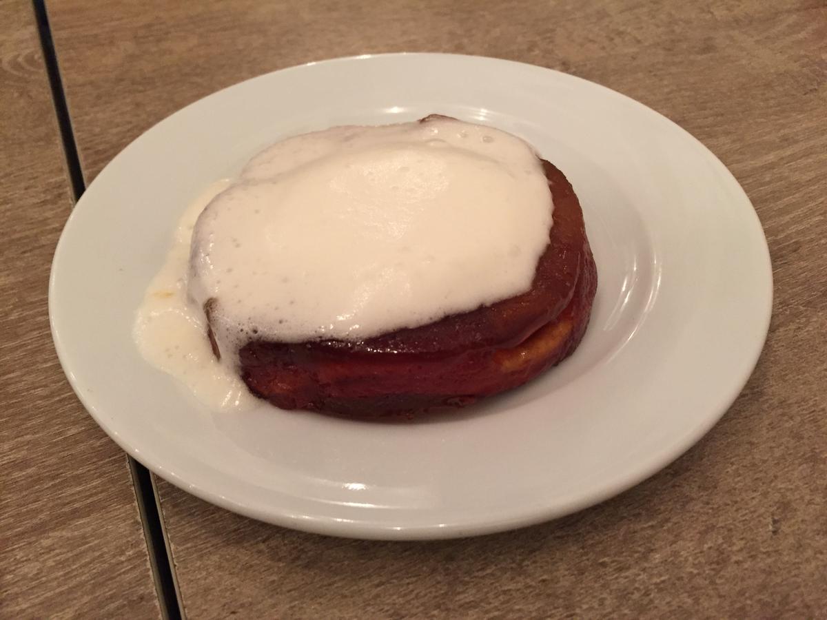 Tarta tatín: acompañada de nata montada (crema de leche), que se deshace bastante con el calor de la tarta, una tatín bastante canónica. Muy buena la parte de la manzana, pero menos conseguida la masa, difícil de cortar.