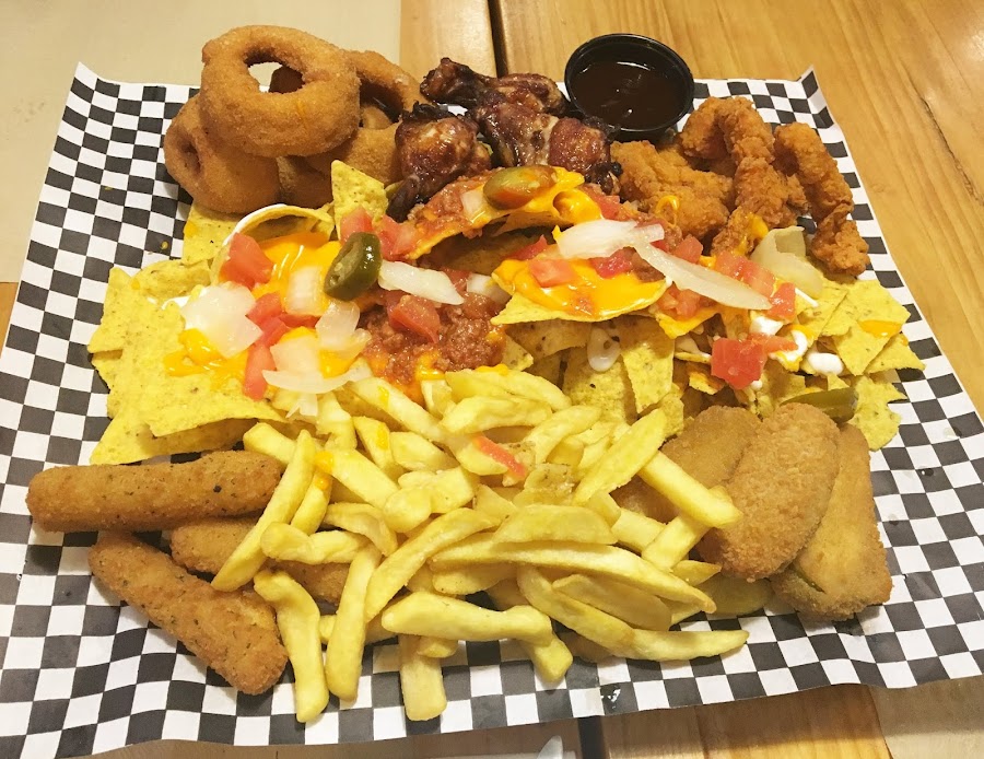 El local es pequeño pero acogedor, decorado en tonos blancos, negros y rojos y muy luminoso, y las mesas bastante amplias y confortables. Estuvimos viendo su amplia carta y al final, como íbamos tres personas, nos decantamos por pedir para compartir el súper combo (con alitas de pollo, nachos con queso y carne, fingers de pollo, palitos de mozzarella, aros de cebolla, jalapeños rellenos de queso y patatas fritas, todo ello acompañado de salsa barbacoa).