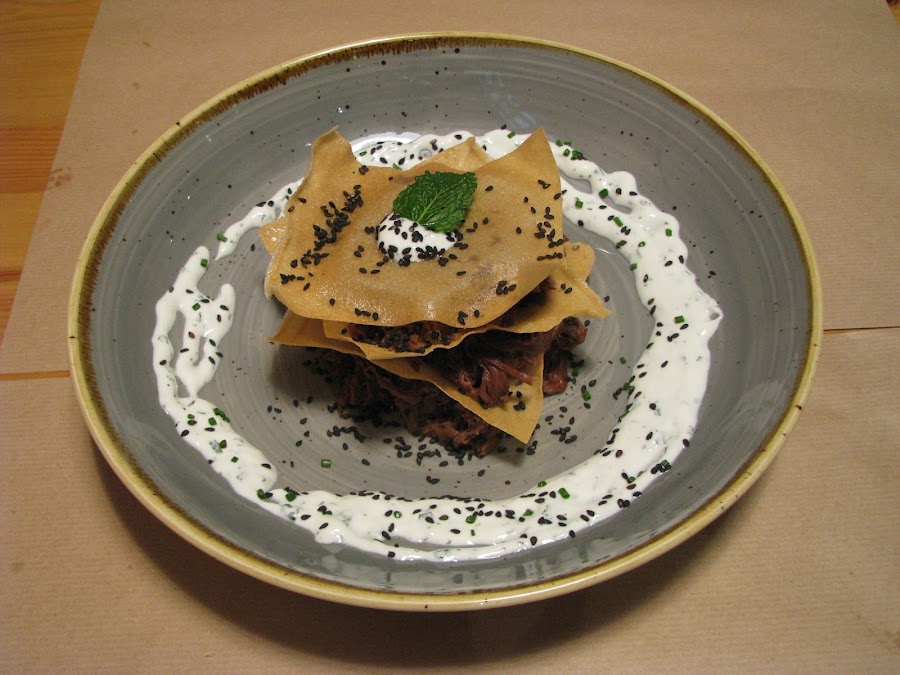 Las milhojas de carne es otro de los platos que sin duda os recomendamos, la carne está muy suave y blandita, se deshace en la boca, y contrasta con las milhojas crujientes. Va acompañada de salsa yogur y sésamo negro, una mezcla que completa el plato a la perfección.