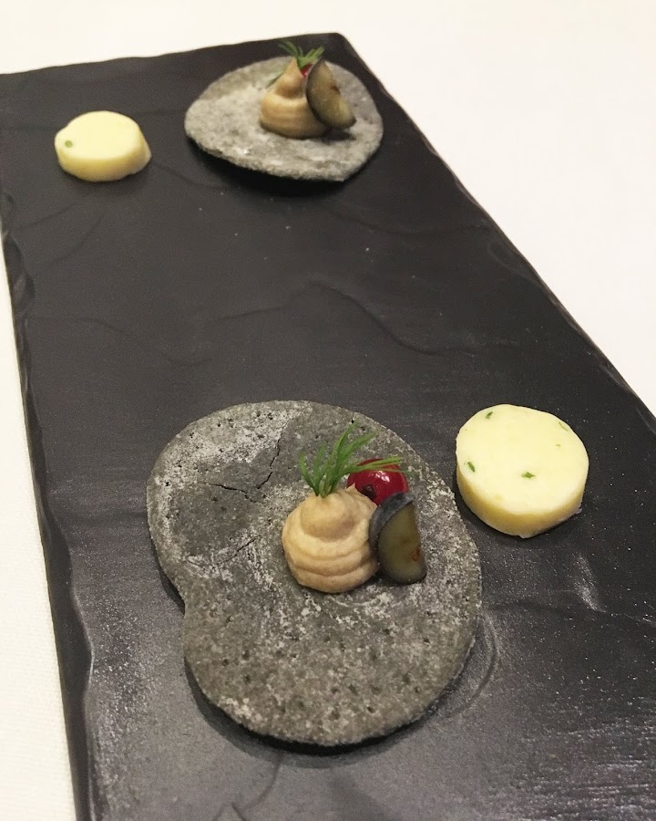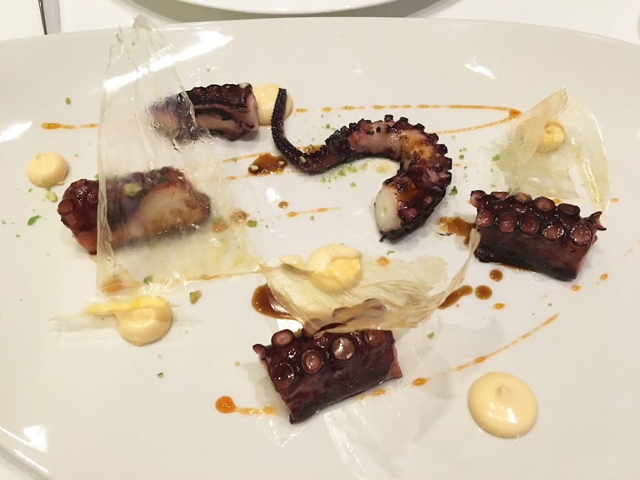No pedimos menú degustación, sino platos sueltos, y comenzamos con un aperitivo de blinis de patata y foie que nos trajeron y una ración de pulpo a la brasa como entrante. Viene acompañado de crema de pimentón de la Vera, caramelo de chile, velo de patata y polvo de wasabi, estaba muy rico de sabor aunque la ración era un poco escueta.