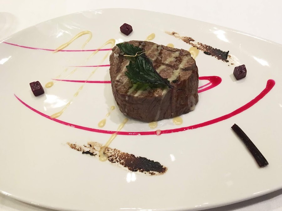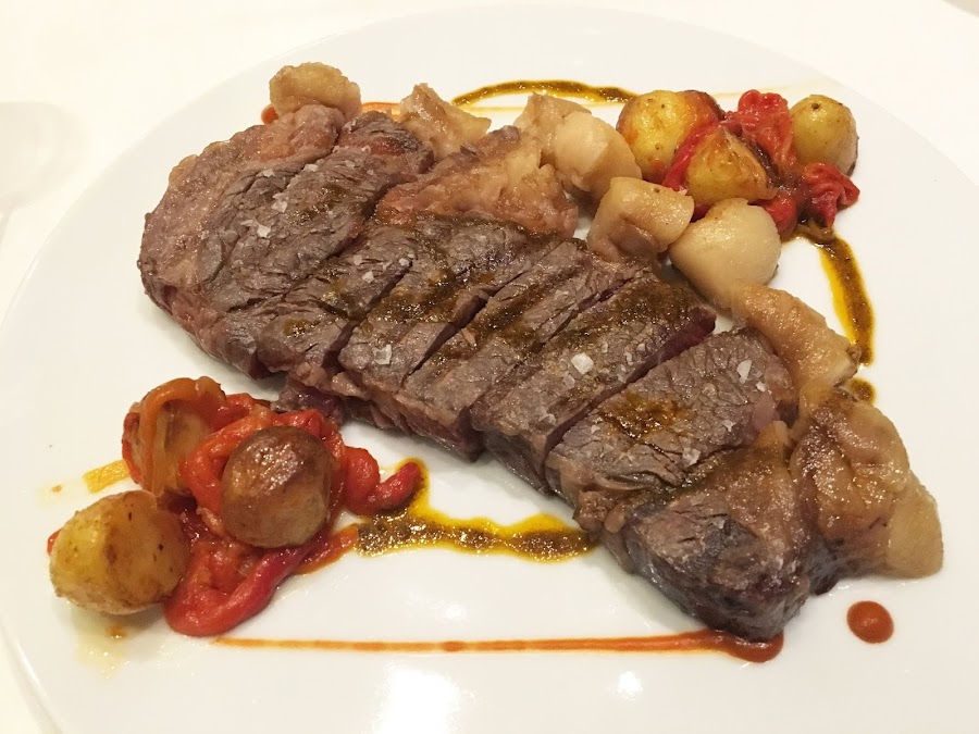 De segundo plato pedimos carne los dos: un solomillo de vaca, remolacha, ajo negro, raíz de cilantro y crema de queso añejo y un lomo bajo de vaca maduro con patata risolada, pimientos asados y salsa chilichurri. Para nuestro gusto, fue lo mejor de la cena, ya que la carne estaba extremadamente tierna y riquísima, si vais tenéis que probarlo.