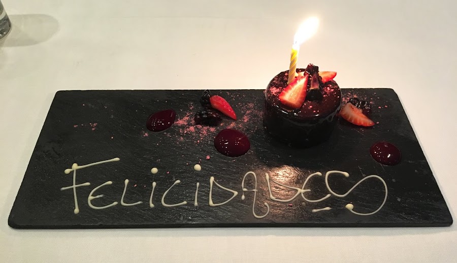 Cuando nos disponíamos a pedir la cuenta me dieron una sorpresa, ya que habíamos reservado mesa allí con motivo de mi cumpleaños y me trajeron una pequeña tarta de chocolate con frutas y con una velita para soplar. Fue un detalle muy amable por su parte que me gustó mucho y me hizo mucha ilusión.