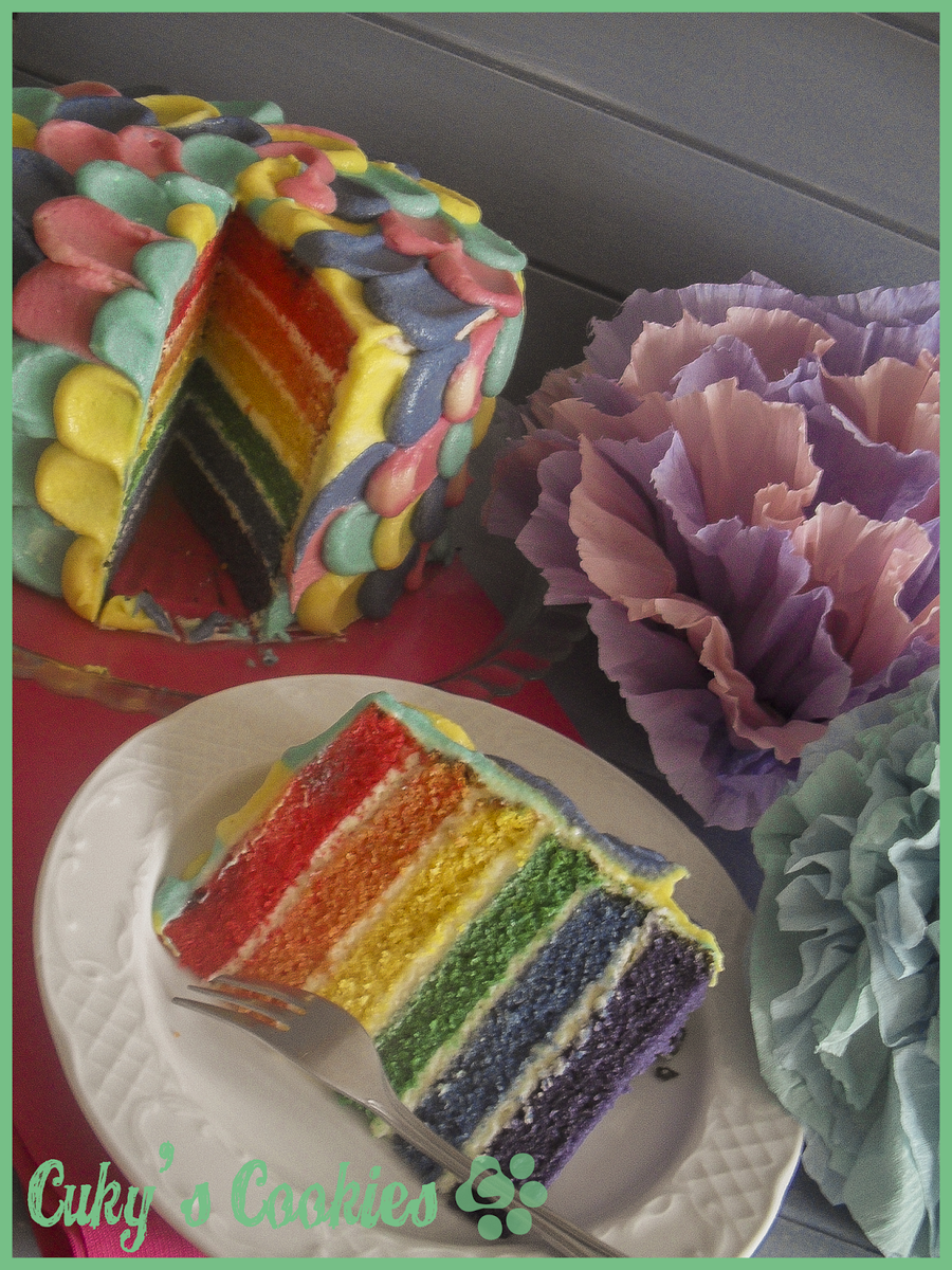 Y la segunda tarta coloreada es especial para cumpleaños infantiles. Mi experiencia es que los niños rara vez se comen la tarta en el cumpleaños, pero es imprescindible prepararla. Esta les va a encantar por la fiesta de colores que tiene dentro y fuera y dejará ojipláticos también a los mayores. ¿Lo bueno? que seguro que también es deliciosa. Es la famosa rainbow cake, de la mano de Cucky"s cookies: