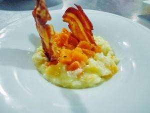 Risotto de calabaza al tomillo, crujiente de panceta ahumada y queso curado