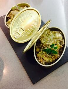 Conserva de arroz negro al horno de Sepia y calamar con espuma de albahaca