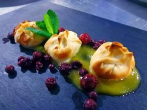 Dimsum crujientes de arroz con leche, crema de mango aromatizado con vainilla y frutos rojos silvestres