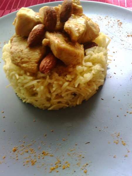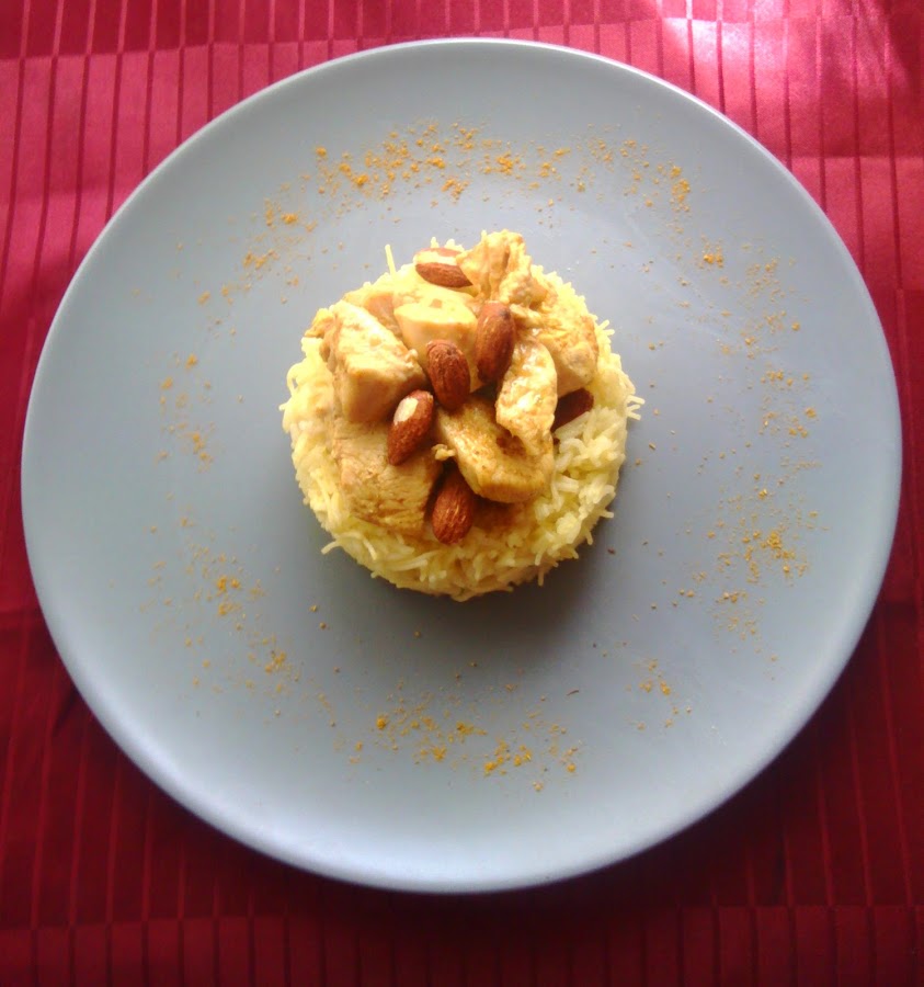 Para montar el plato usamos un aro de emplatado y lo rellenamos con nuestro arroz, colocamos encima unos trocitos de pollo y unas cuantas almendras, decoramos el plato con un poco de curry en polvo.