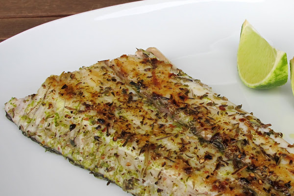 Colocar en la base de un plato un poco de aceite, hierbas provenzales, una pizca de sal y de mezcla de pimientas molidas. Poner el pescado sobre la piel, presionando ligeramente para que se adhieran. Espolvorear por encima los mismos ingredientes, hierbas, sal y pimientas. Repartir por la superficie la ralladura de la piel de la lima.