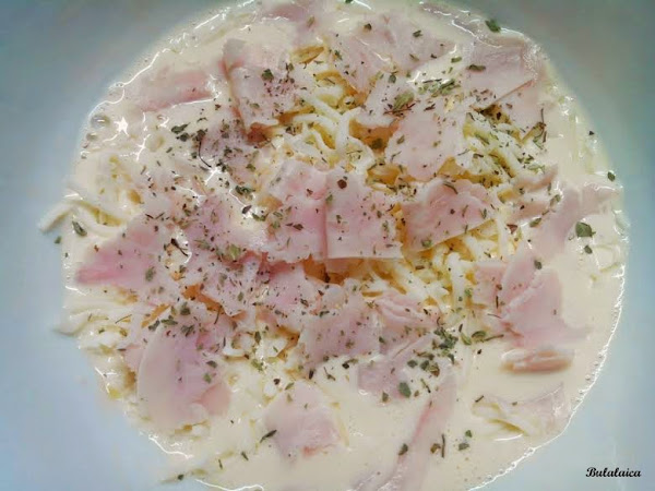 5. Mientras la masa está en el horno, mezclamos en un bol el huevo batido, la nata (crema de leche), el pavo braseado, el queso Emmental rallado, sal, pimienta y el toque de orégano.