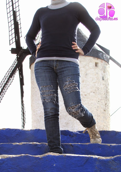 4º Coser las mallas al vaquero. O mejor aun no coserlas y así podemos cambiar la malla que se ve bajo el vaquero por cualquier otra y le da otro aire completamente distinto.