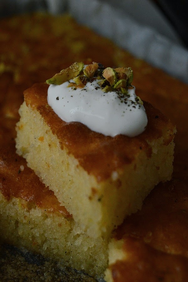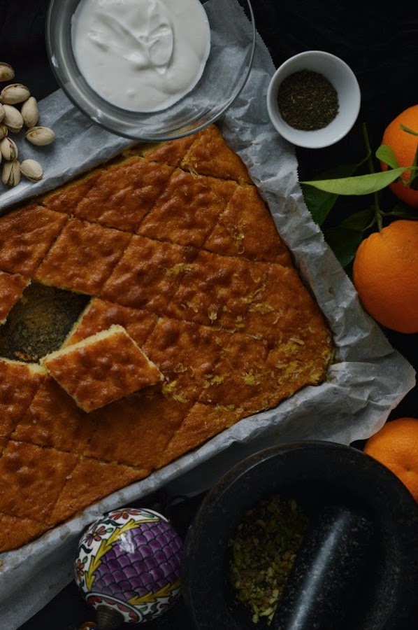 Para servir, ponemos encima de cada rombo, un poco de la mezcla de yogurt con un poco de menta seca y los pistachos machacados.Consejo: Este pastel está mejor de un día para otro, os lo aseguro.