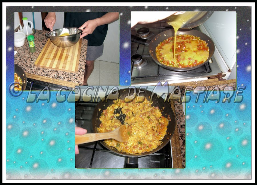 Batimos los huevos con un ligero toque de sal y una pizca de perejil picado. Los añadimos a la sartén y cuajamos a fuego medio mezclando continuamente hasta el punto deseado( yo he utilizado una cuchara de madera para evitar rallar la sartén ) . A mi particularmente me gusta bien cuajadito, pero eso va al gusto de cada uno.
