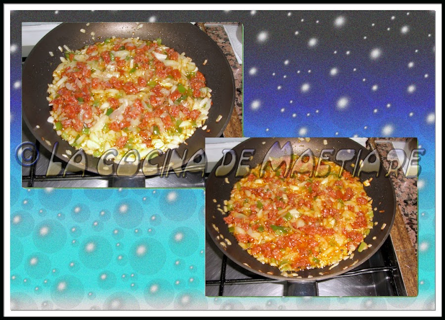 En una sartén antiadherente pochamos la cebolla y el pimiento picado fino con un pequeño toque de sal ( ojo lo justo pues el chorizo le aportará mucho sabor y los huevos batidos también tendrán su pizca de sal ). Cuando esté transparente le añadimos los chorizos picados ( en trozos pequeñitos ) y cocinamos el conjunto hasta que el chorizo haya soltado algo de substancia aportando color y sabor al sofrito.