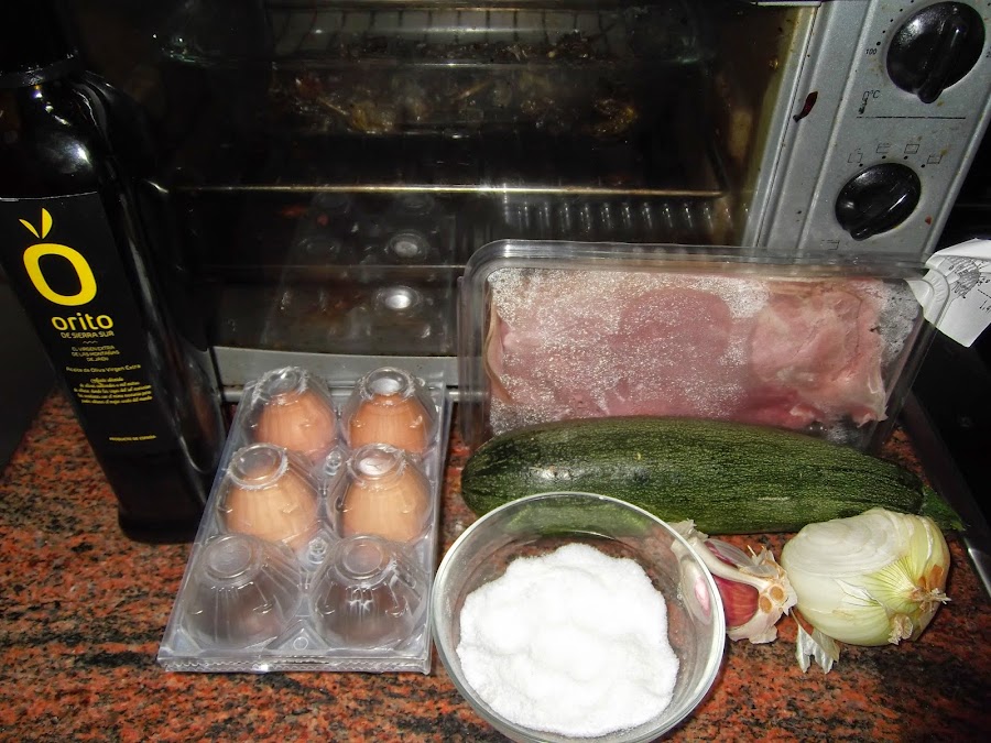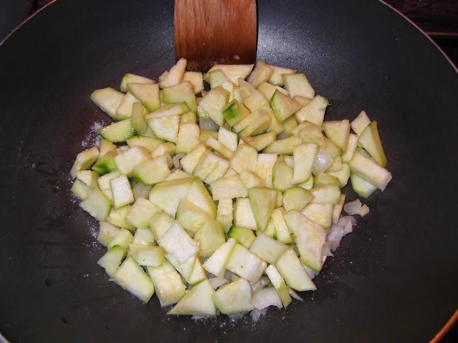 Lo primero que hacemos es echar un chorro generoso de aceite en la sartén, pelar y cortar los ajos en trozos muy pequeños. Cuando está el aceite caliente los añadimos, ahora hacemos lo mismo con la cebolla y también la echamos en la sartén. Cuando está transparente, le añadimos el calabacín, en este caso lo he pelado y lo he cortado en trozos medianos, pero si vais con prisa podéis dejar la piel y cortarlo en trozos más grandes. Echarle un buen puñado de sal, ya que es una verdura un poco sosa.