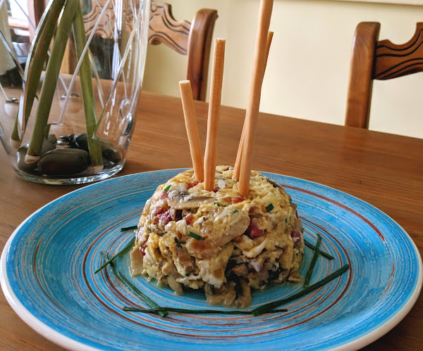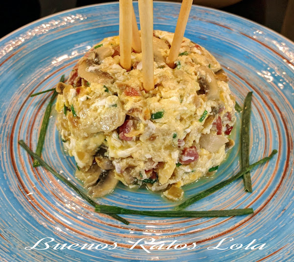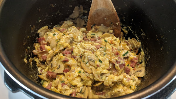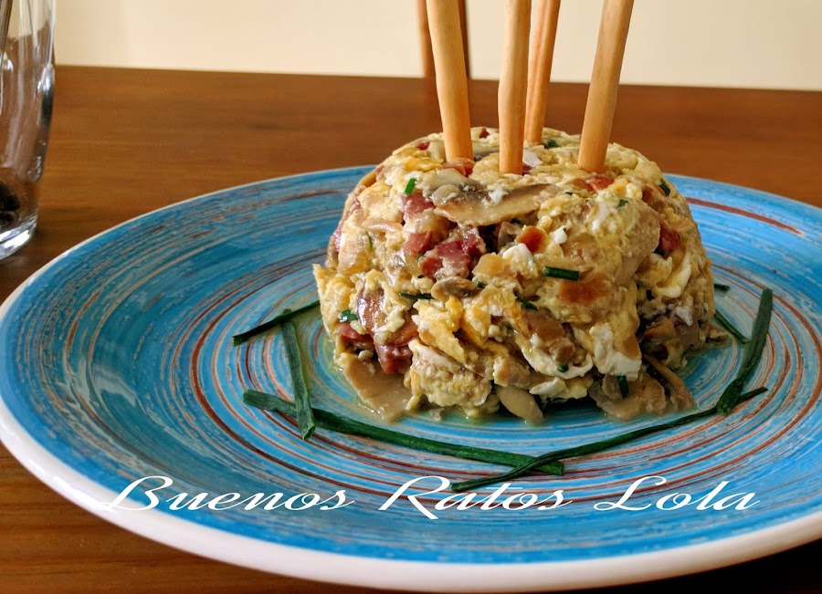 Dejamos que se hagan unos minutos y ponemos el jamón. Rehogamos muy poco, en cuanto cambian de color echamos los huevos sin batir y el cebollino picado