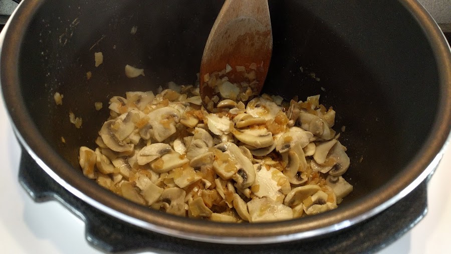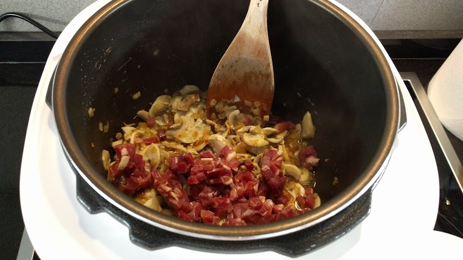 2 cucharadas de cebollino fresco Ponemos el aceite y la cebolla cortada en trocitos en la cubeta, menú freír y dejamos que se sofría. Mientras limpiamos con un paño los champiñones o los pelamos y laminados. Cuando la cebolla empieza a dorarse añadimos los champiñones