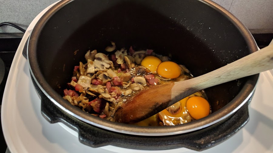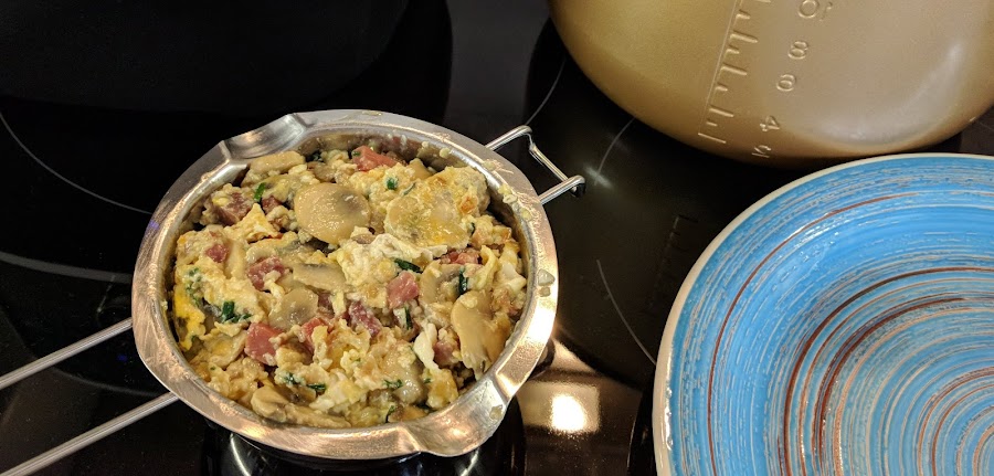 Frie y saltea todo en menú sofreír a 160 grados. Antes de cuajar los huevos asegúrate de que la cubeta no se pega. Si así fuera, usa una limpia para terminar el plato. Unta con aove y pon menú sofreír a 140 grados. Termina el plato como en el caso anterior