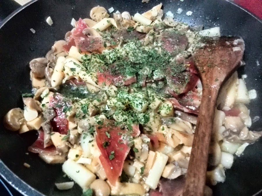 Añadimos los champiñones escurridos y rehogamos a fuego suave durante unos minutos.