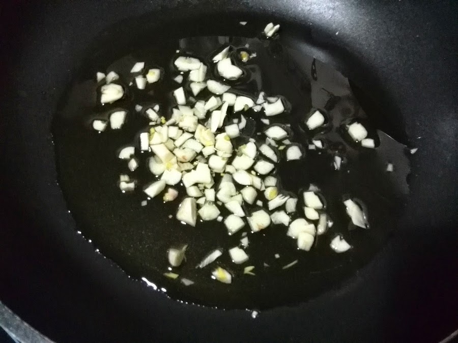 Ponemos en una sartén un chorrito de aceite y doramos el ajo pelado y picado.