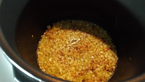 Seleccionamos menú freír. Ponemos en la cubeta la cebolla y el aceite. Removemos y dejamos que se saltee hasta que esté dorada