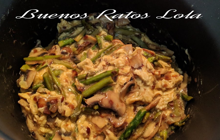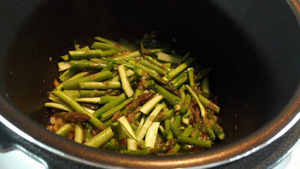 Añadimos los espárragos troceados. Si son demasiado gruesos podemos cortarlos longitudinalmente