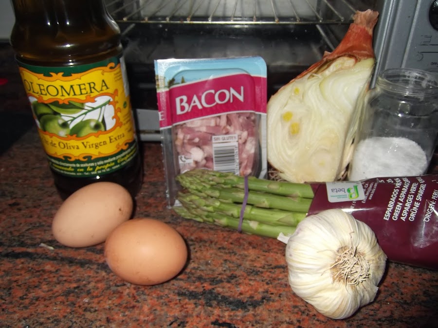 El siguiente paso es trocear la cebolla y picar el ajo. Echamos un poco de aceite en una sartén y echamos la cebolla y el ajo. Cuando la cebolla esté transparente, añadimos el bacon y mientras tanto vamos cortando los espárragos verdes. Cuando el bacon ha tomado algo de color añadimos los espárragos, salamos y le damos un par de vueltas para que se mezcle todo.