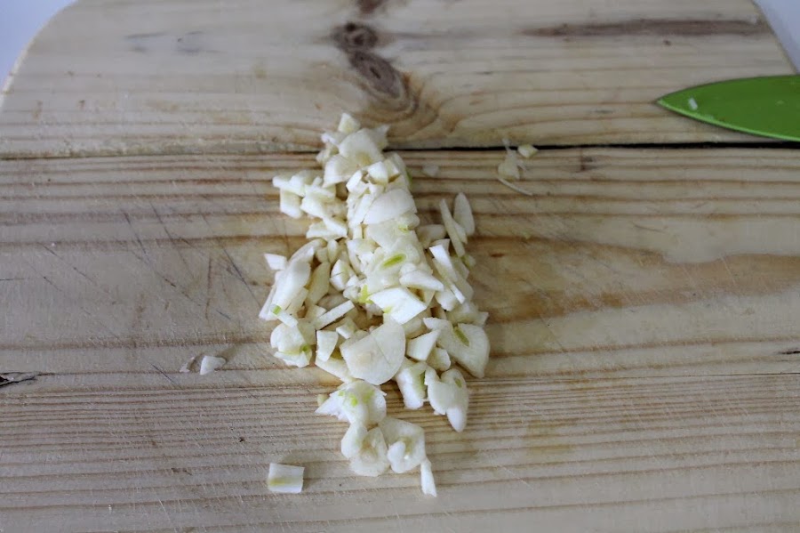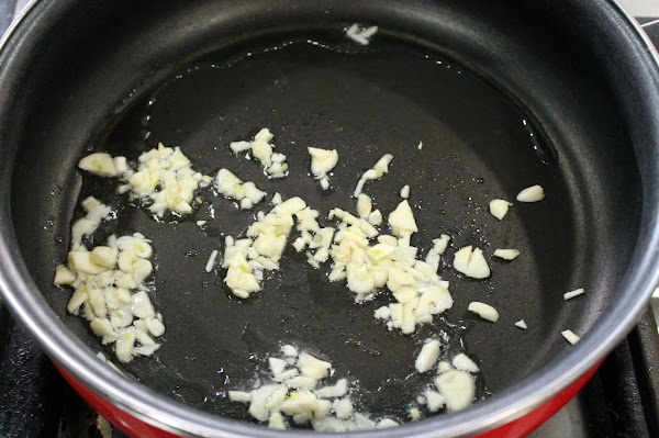 Ponemos una sartén al fuego, ponemos el aceite y cuando esté caliente incorporamos los ajos picados y removemos hasta que estén un poco dorados y con cuidado de que no se nos quemen.