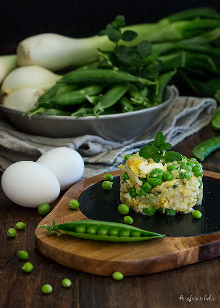 Picar las cebolletas frescas y sofreírlas suavemente hasta que empiecen a dorarse, añadir los guisantes desgranados y dar unas vueltas. Salpimentar.