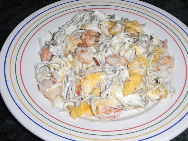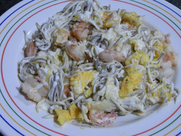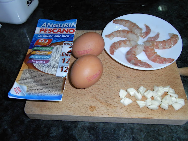 Se pone una sartén al fuego con un chorrito de aceite de oliva y se saltean ligeramente los ajos, se añaden las angulas sucedáneas y se les da una vuelta para que cojan el sabor de los ajos. Se añaden los gambones y se saltea todo un minuto para que los gambones queden tiernos. Se cascan los 2 huevos sobre las angulas sucedáneas y se salpimientan al gusto, se remueven un poco y ya está ... a cenar!