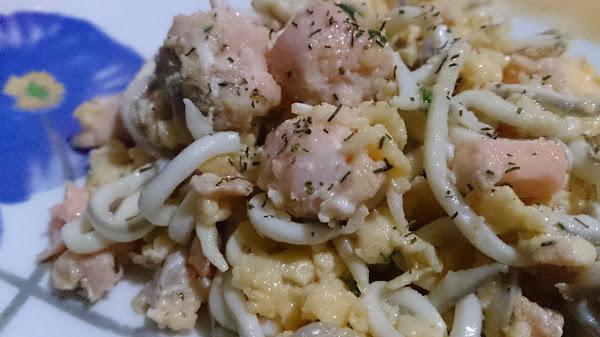 Cuando ya esté casi echo, agregamos las angulas sucedáneas, volteamos un poco e incorporamos los huevos batidos.
