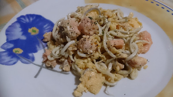 Cuando ya esté casi echo, agregamos las angulas sucedáneas, volteamos un poco e incorporamos los huevos batidos.