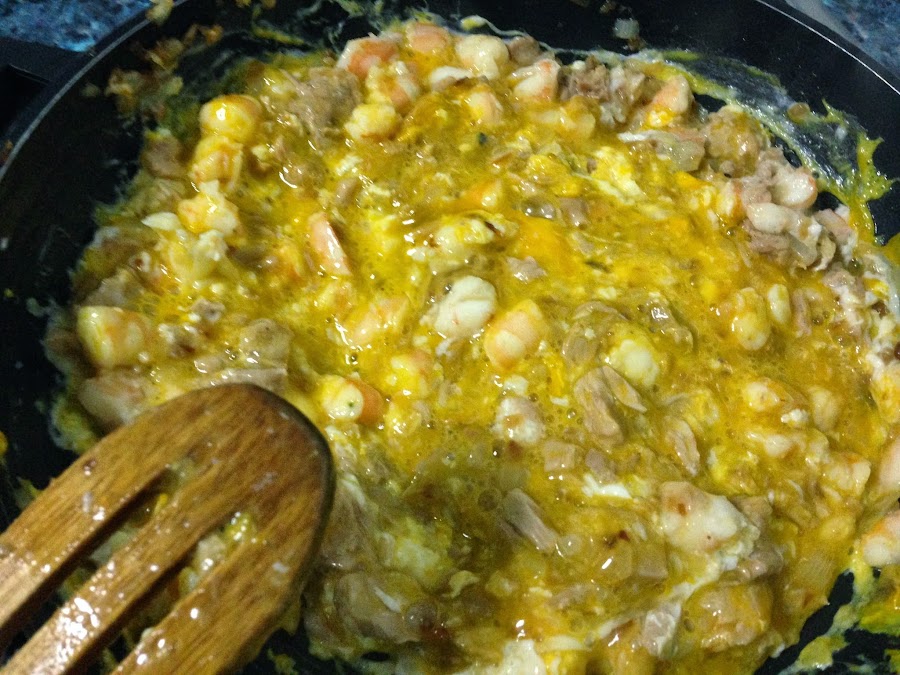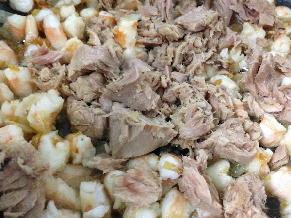 Yo he utilizado langostinos ya cocidos, pero si los tenéis frescos, antes de sofreír los ajos, los coceremos y pelaremos.