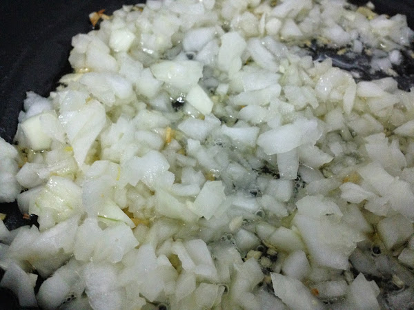 Vamos a empezar sofriendo los dos dientes de ajo muy picaditos y la media cebolla sobre un pequeño chorro de aceite de oliva a fuego medio.