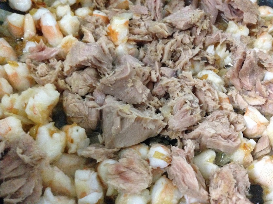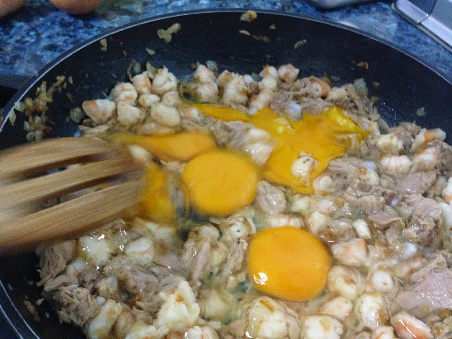 Después añadiremos el atún al natural, y seguido los 4 huevos camperos sin batir.