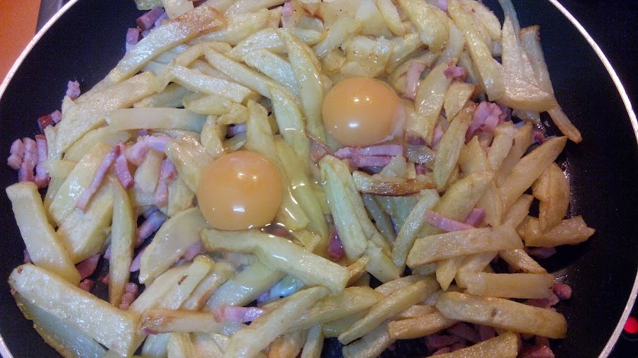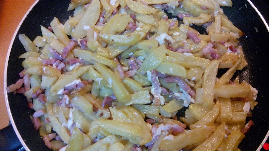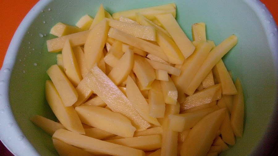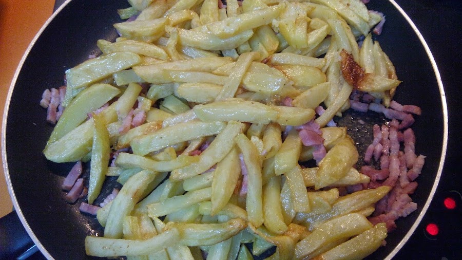 Pelamos las patatas, las lavamos y las cortamos en tiras, como se cortan normalmente las patatas fritas. Las freímos. No es necesario que se doren demasiado. Reservamos.