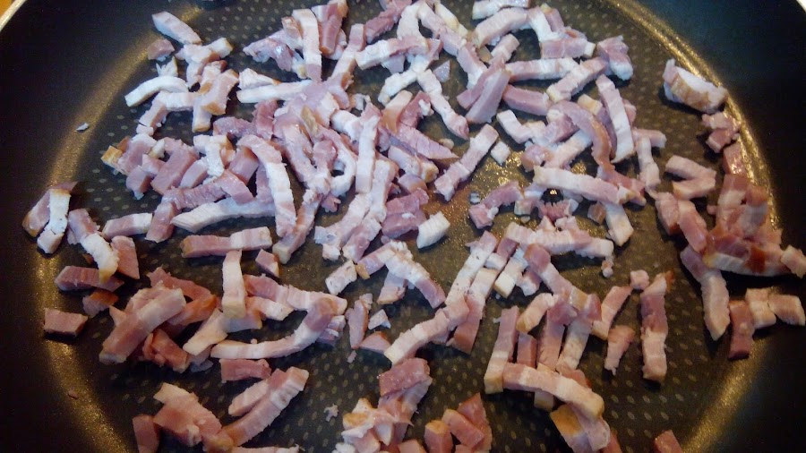En una sartén amplia ponemos a freír el bacon. No es necesario echar aceite ya que el bacon suelta grasa.