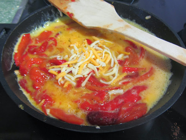 Añadimos los huevos batidos y, en su caso, el queso, y removemos constantemente hasta que los huevos se cuajen. A mí me gusta que queden sequitos, pero cremosos, pero el punto del cuajado depende de nuestro gusto personal.