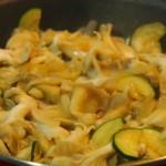 En una sartén con 2 cucharadas de aceite de oliva ponemos a pochar la cebolla en juliana y 2 minutos después el calabacín cortado en medias rodajas finas y las setas troceadas groseramente. Salpimentamos y le damos a todo ello unas vueltas en la sartén hasta obtener el punto de pochado de las verduras que más nos guste.