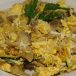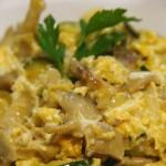 Añadimos los huevos (sin batir) y un chorrito de nata (crema de leche). Movemos un poco el contenido de la sartén para que vayan cuajando de forma irregular y lo retiramos del fuego sin dejar que cuajen excesivamente.