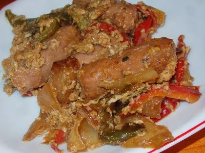 Corta cebolla y pimientos en juliana. Echa un poco de aceite en la sartén y pocha la cebolla y los pimientos a fuego medio. Añade las salchichas frescas cortadas en dos y sigue la cocción a fuego medio. Al cabo de un ratito añade la cerveza y deja reducir la salsa.