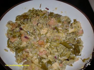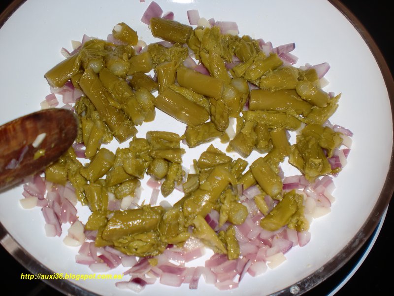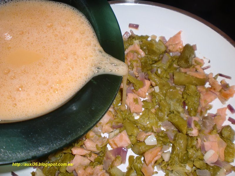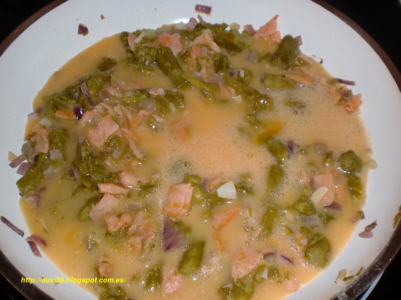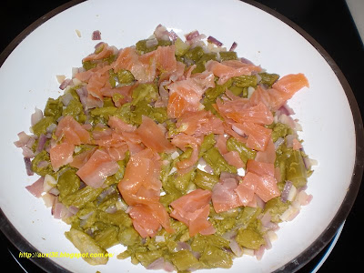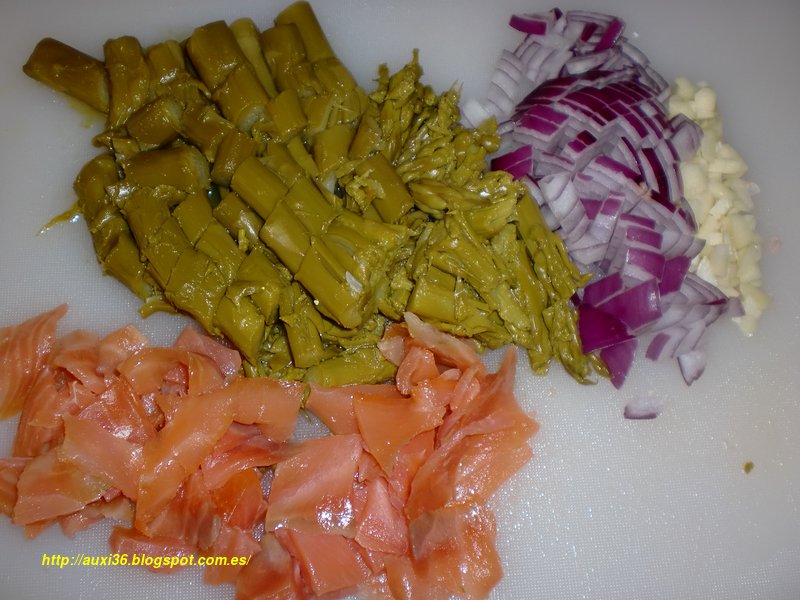Espárragos ,salmón ahumado,huevos,cebolla,ajos,aceite de oliva y sal.