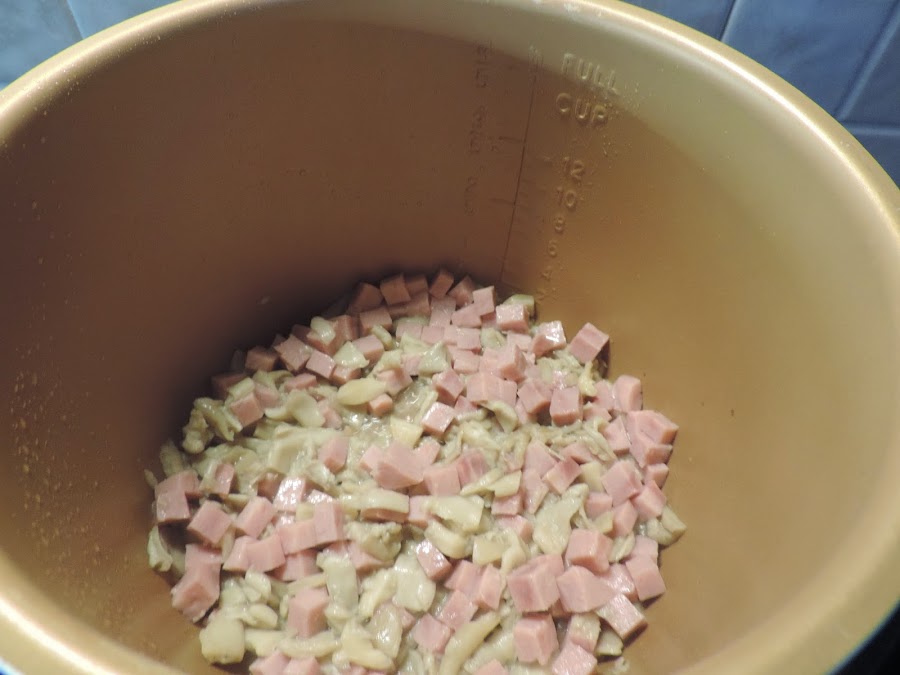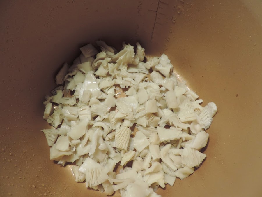Poner aceite de oliva en la cubeta de la olla, echamos las setas cortadas en trozos.