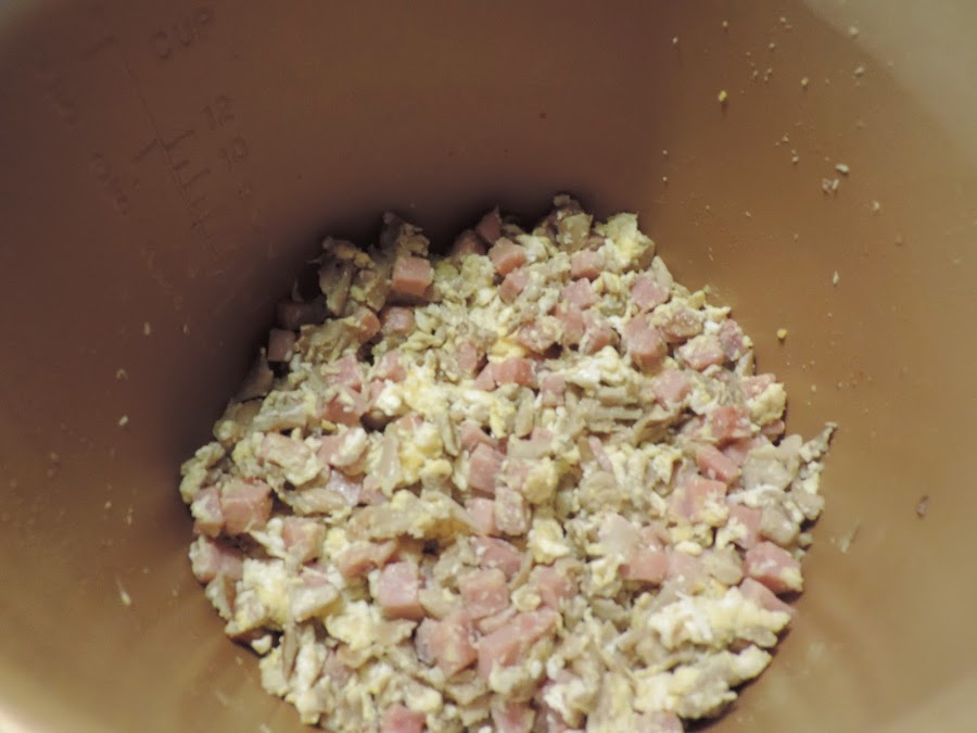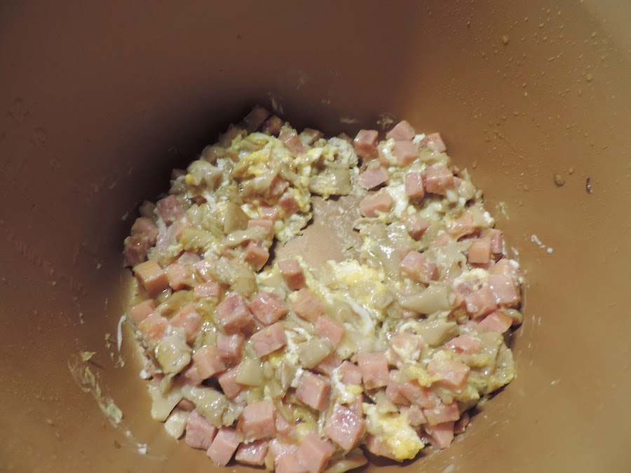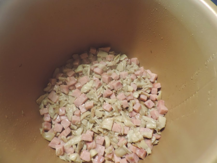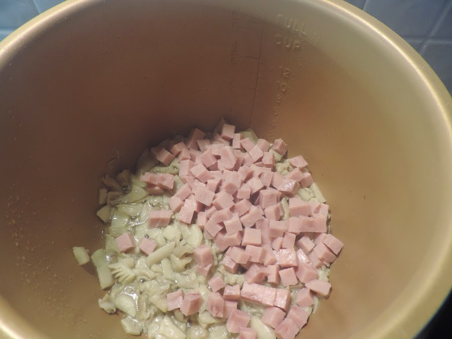 Cortamos en trozos el jamón york y lo añadimos.