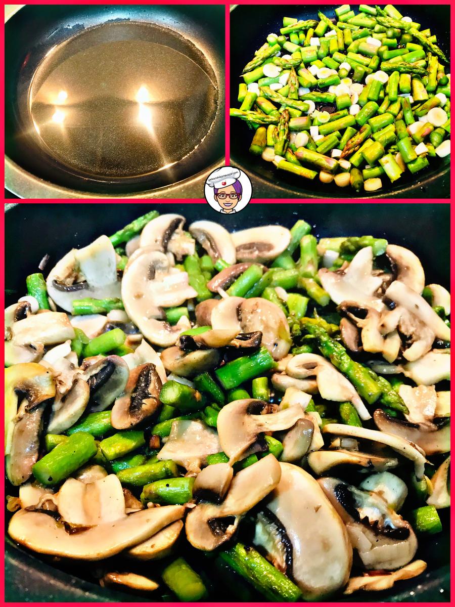 En una sartén con aceite de oliva salteamos los ajetes y los espárragos