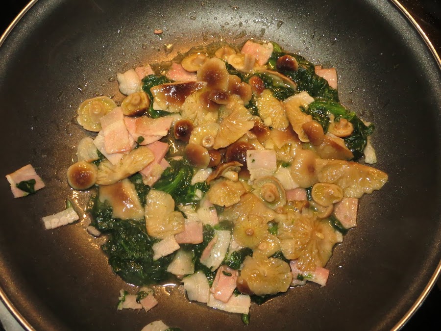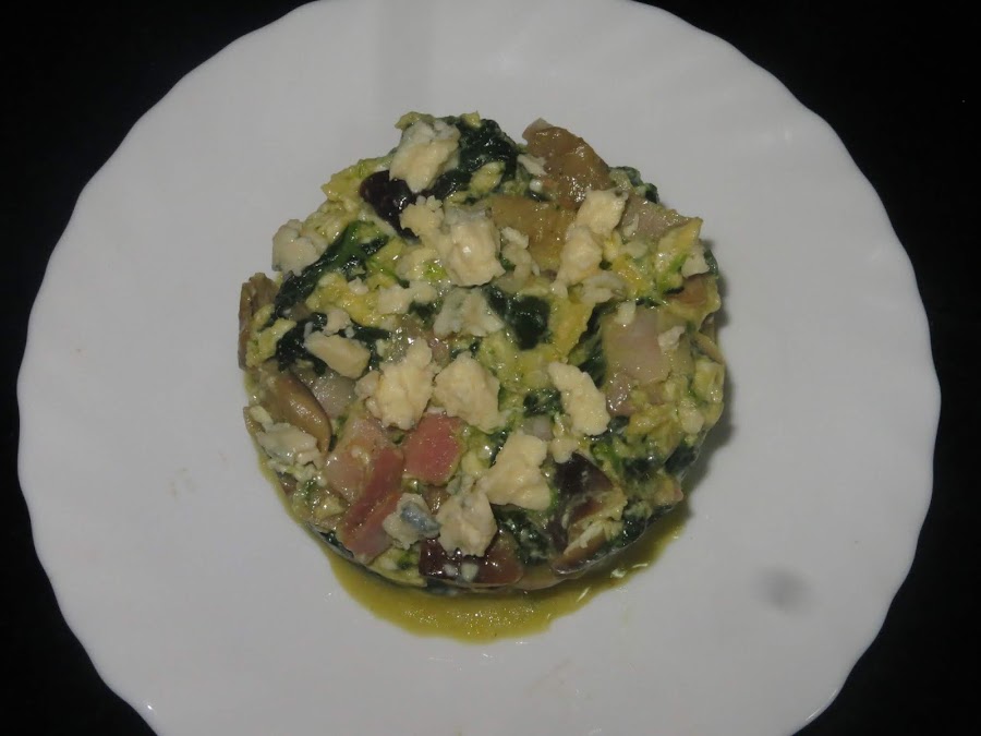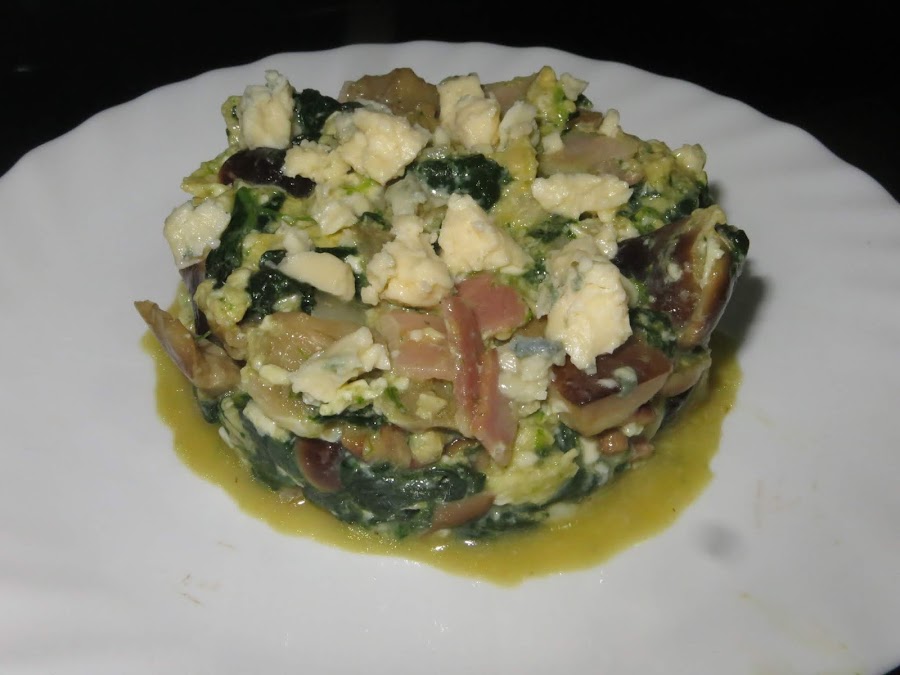 En la sartén donde hemos elaborado las setas, echamos el bacon y cuando esté dorado añadimos las setas y las espinacas. Cascamos los cuatro huevos y damos vueltas para hacer el revuelto, justo antes de sacarlo añadimos la mitad del queso azul.