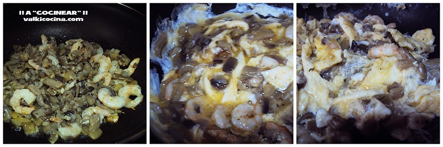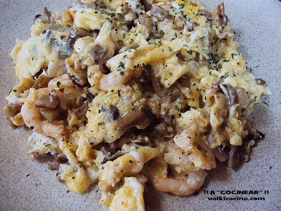 En esta ocasión, te traigo un revuelto con una combinación muy sabrosa de setas y gambas, pero no dudes en utilizar otros ingredientes de tu gusto, que tengas por la nevera o despensa y aprovechar así restos de guarniciones, verduras, latas , etc ...