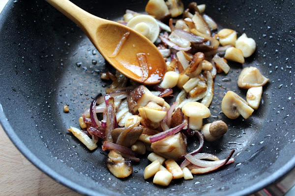 En una sartén con aceite caliente, salteamos las setas troceadas, con la cebolla. Punto de sal.