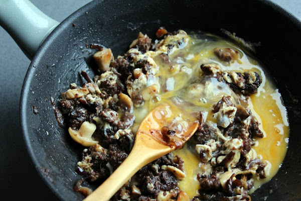 Retiramos la sartén del fuego, añadimos los huevos y removemos.