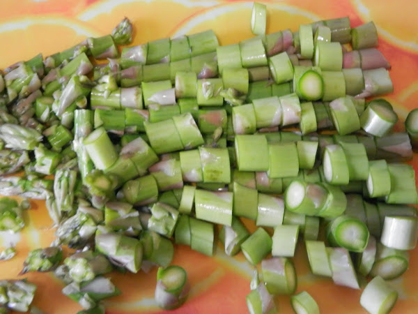 En una sartén ponemos el aceite a calentar, y cuando ya esté caliente añadimos los espárragos, que por dureza son los que más tiempo van a tardar en cocinarse.