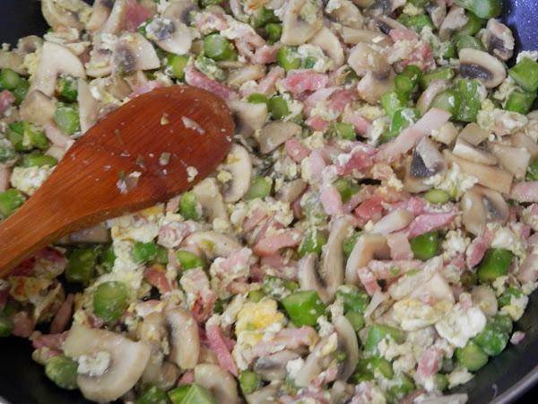 Como vais viendo, en casa gustan mucho los revueltos y salteados, y la verdad es que nos encantan y el pitufo se lo come de maravilla, así que como el otro día utilicé la otra mitad de los espárragos, aquí os traigo hoy un revuelto de trigueros con champiñones y bacon.